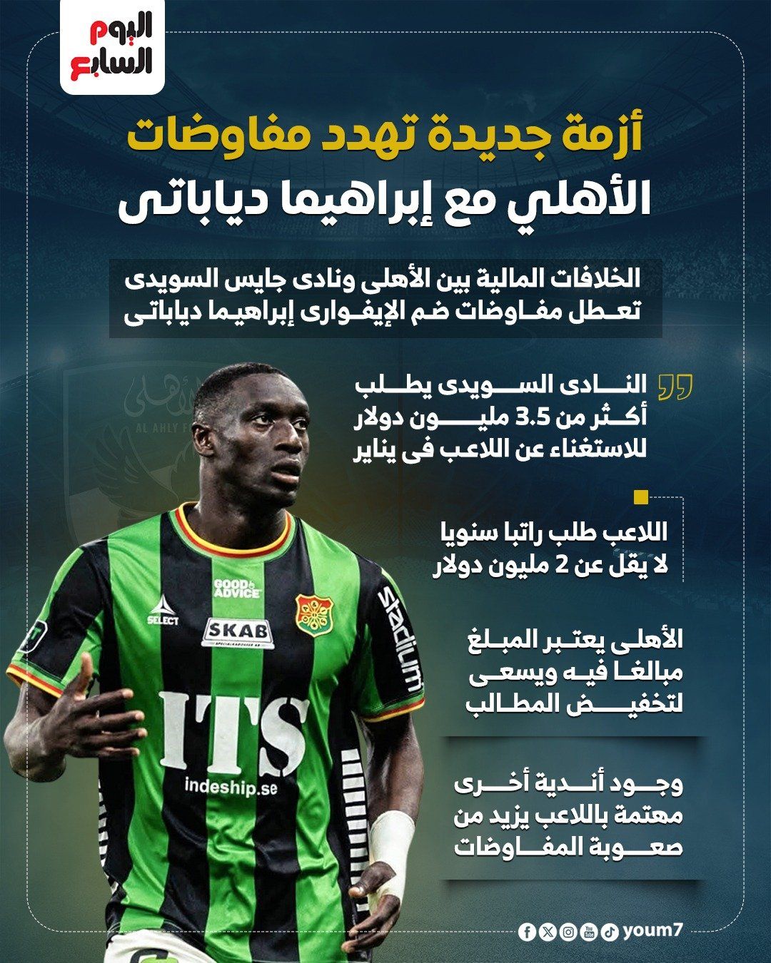 الأحد، 07 ديسمبر 2025 05:41 متواجه مفاوضات النادي الأهلي مع الإيفواري إبراهيم دياباتي مهاجم نادي جايس السويدي عدة صعوبات خلال الأيام الماضية، بسبب الخلافات المالية الكبيرة بين الناديين، بجانب مطالب اللاعب الكبيرة من أجل الموافقة على عرض الأهلي.