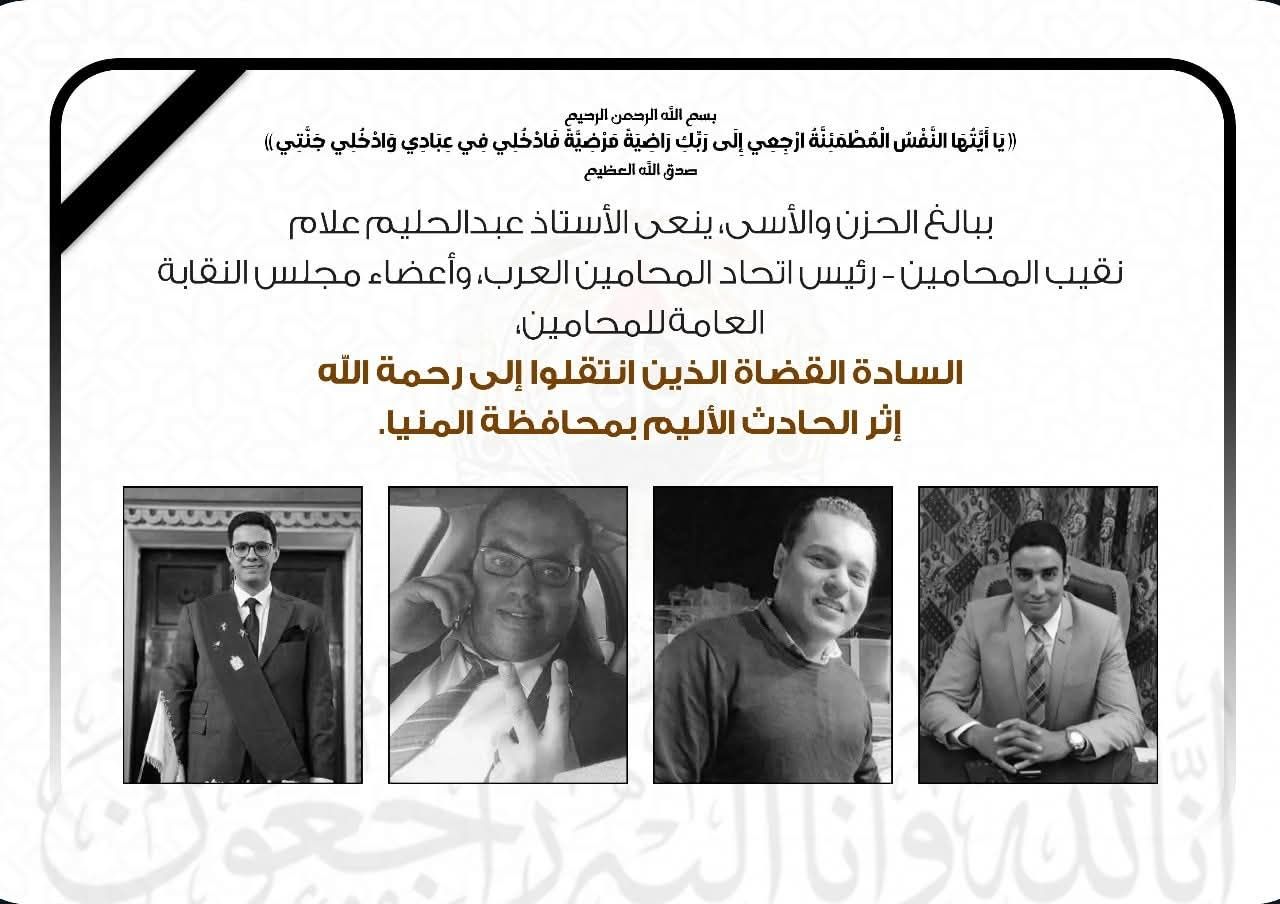وجاء في النعي: ببالغ الحزن والأسى، ينعى عبدالحليم علام نقيب المحامين – رئيس اتحاد المحامين العرب، وأعضاء مجلس النقابة العامة للمحامين، القضاة الذين انتقلوا إلى رحمة الله إثر الحادث الأليم بمحافظة المنيا.