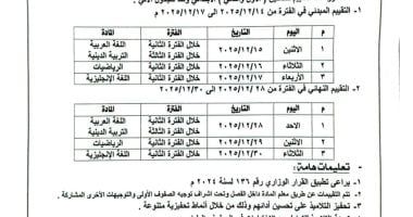 أما التقييم النهائي فيكون في الفترة ما بين 28 ديسمبر وحتى يوم 30 ديسمبر الجارى، ويكون يوم الأحد 28 ديسمبر للغة العربية والتربية الدينية، ويوم الإثنين 29 ديسمبر للرياضيات، ويوم الثلاثاء 30 ديسمبر للغة الإنجليزية.