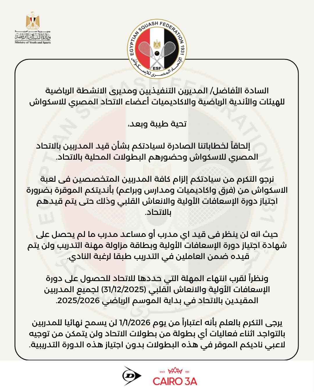 السادة الأفاضل المديرين التنفيذيين ومديرى الانشطة الرياضية الهيئات والأندية الرياضية والاكاديميات أعضاء الاتحاد المصري للاسكواش، تحية طيبة وبعد،إلحاقاً لخطاباتنا الصادرة لسيادتكم بشأن قيد المدربين بالاتحاد المصري للاسكواش وحضورهم البطولات المحلية بالاتحاد.