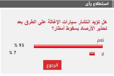 وأيد 93% من القراء مطالب تكثيف نشر سيارات الإغاثة، مع توقعات الأرصاد باستمرار سقوط الأمطار،، بينما عارض 7% من القراء مطالب تكثيف نشر سيارات الإغاثة، مع توقعات الأرصاد باستمرار سقوط الأمطار.
