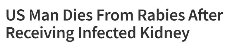 ووفقا لموقع "science alert"، كشف تحقيق دقيق أجرته مراكز السيطرة على الأمراض والوقاية منها عن السبب، حيث أصيبت الكلية المتبرع بها لرجل من ميشيغان بالفيروس القاتل، وهي المرة الرابعة فقط التي ينتقل فيها داء الكلب عن طريق الأعضاء المزروعة في الولايات المتحدة منذ عام 1978.