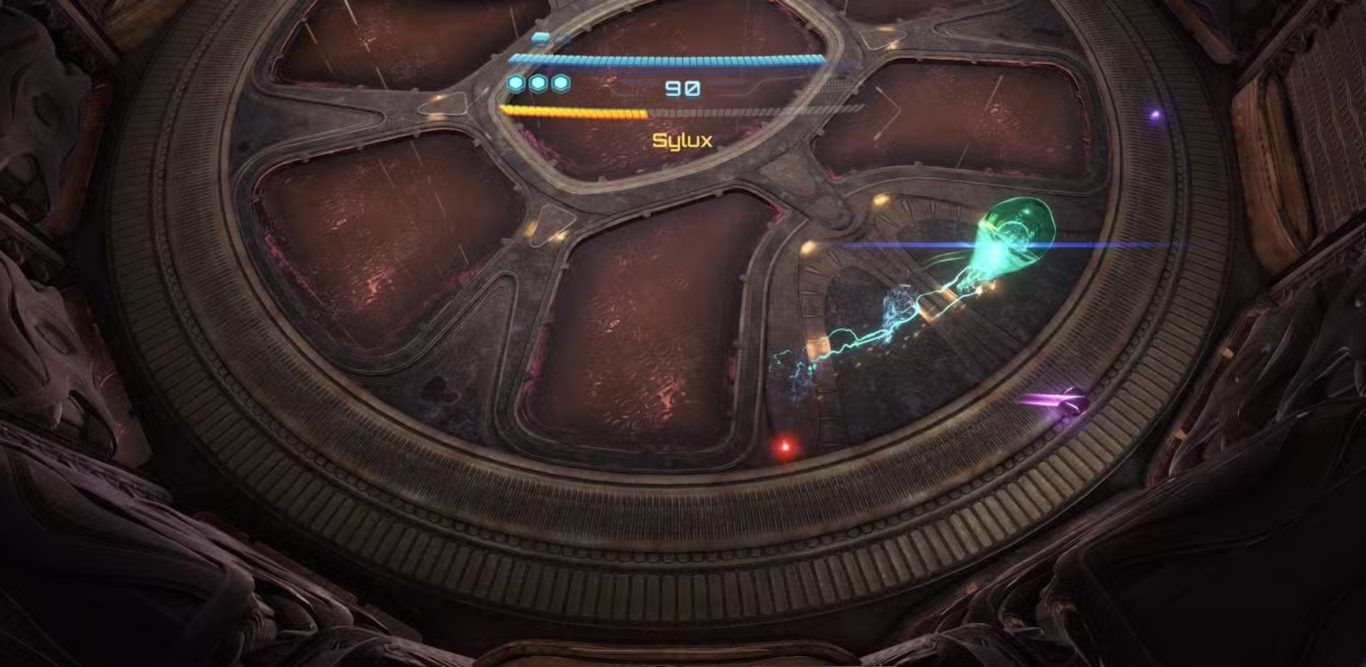 ويخرج Sylux لاحقًا من Energy Tornado وقد يدمج بعض هجمات Melee Dash لذا يُنصح بالحذر من اندفاعه المفاجئ.