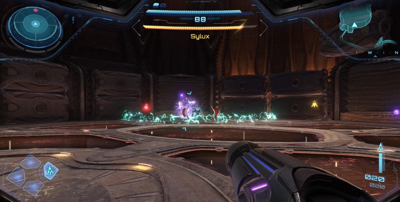 | Energy Bombardment | ينتقل Sylux إلى منتصف الساحة ويطلق ثلاث موجات من قنابل الطاقة تنتشر بشكل دائري، مع توسع كل موجة أكثر فأكثر بعيدًا عن مركز الغرفة. |