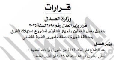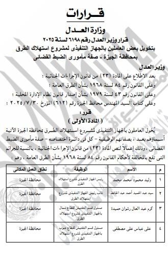 الأربعاء، 10 ديسمبر 2025 09:31 صنشرت الجريدة الرسمية، قرار وزير العدل رقم 6198 لسنة 2025، بشأن تخويل بعض العاملين بالجهاز التنفيذي لمشروع استهلاك الطرق بمحافظة الجيزة، صفة مأموري الضبط القضائي.
