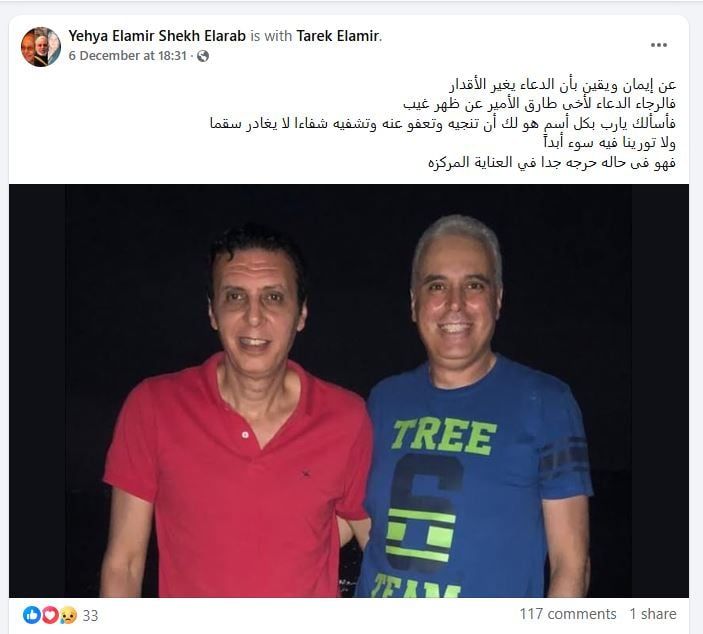شقيق طارق الأمير يطلب الدعاءونشر شقيق الفنان طارق الأمير صورة تجمعهما، معبراً عن ثقته في قوة الدعاء، وكتب:"عن إيمان ويقين بأن الدعاء يغير الأقدار، فالرجاء الدعاء لأخى طارق الأميرعن ظهر غيب، فأسألك يا رب بكل اسم هو لك أن تنجيه وتعفو عنه وتشفيه شفاءً لا يغادر سقماً، ولا تورينا فيه سوء أبداً، فهو فى حالة حرجة جداً فى العناية المركزة."