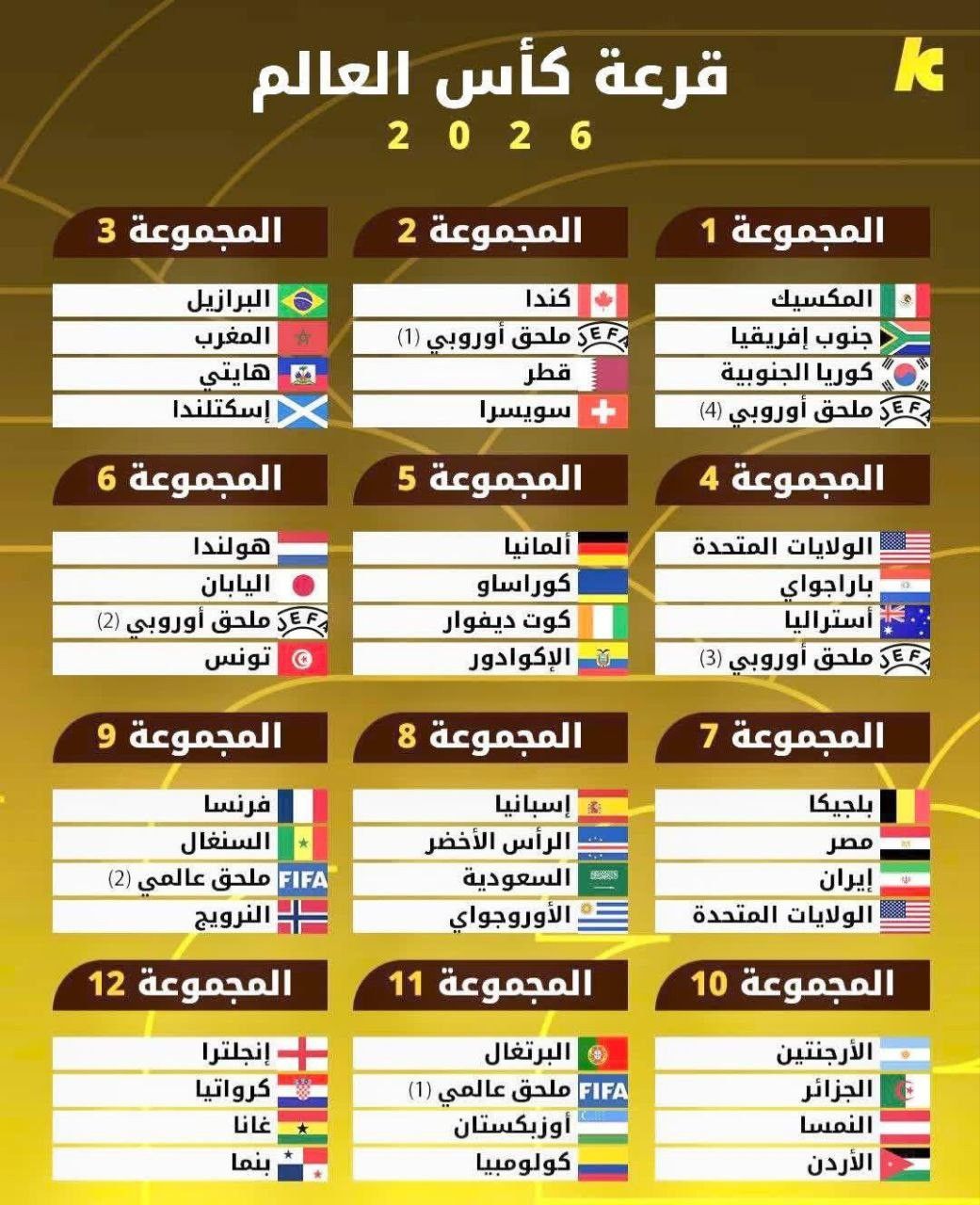 نتائج قرعة بطولة كأس العالم لكرة القدم 2026 التي سُحبت في العاصمة الأميركية واشنطن كما يلي: