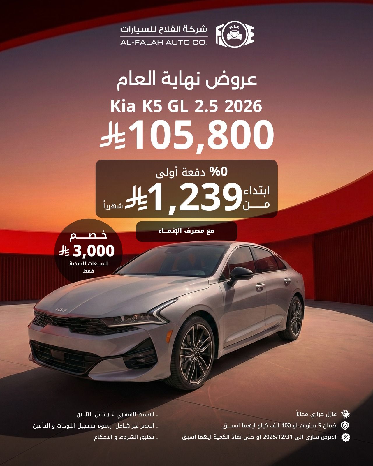- سعر سيارة Kia K5 2026 كاش 105.800 ريال / التقسيط 1.239 ريال سعودي
