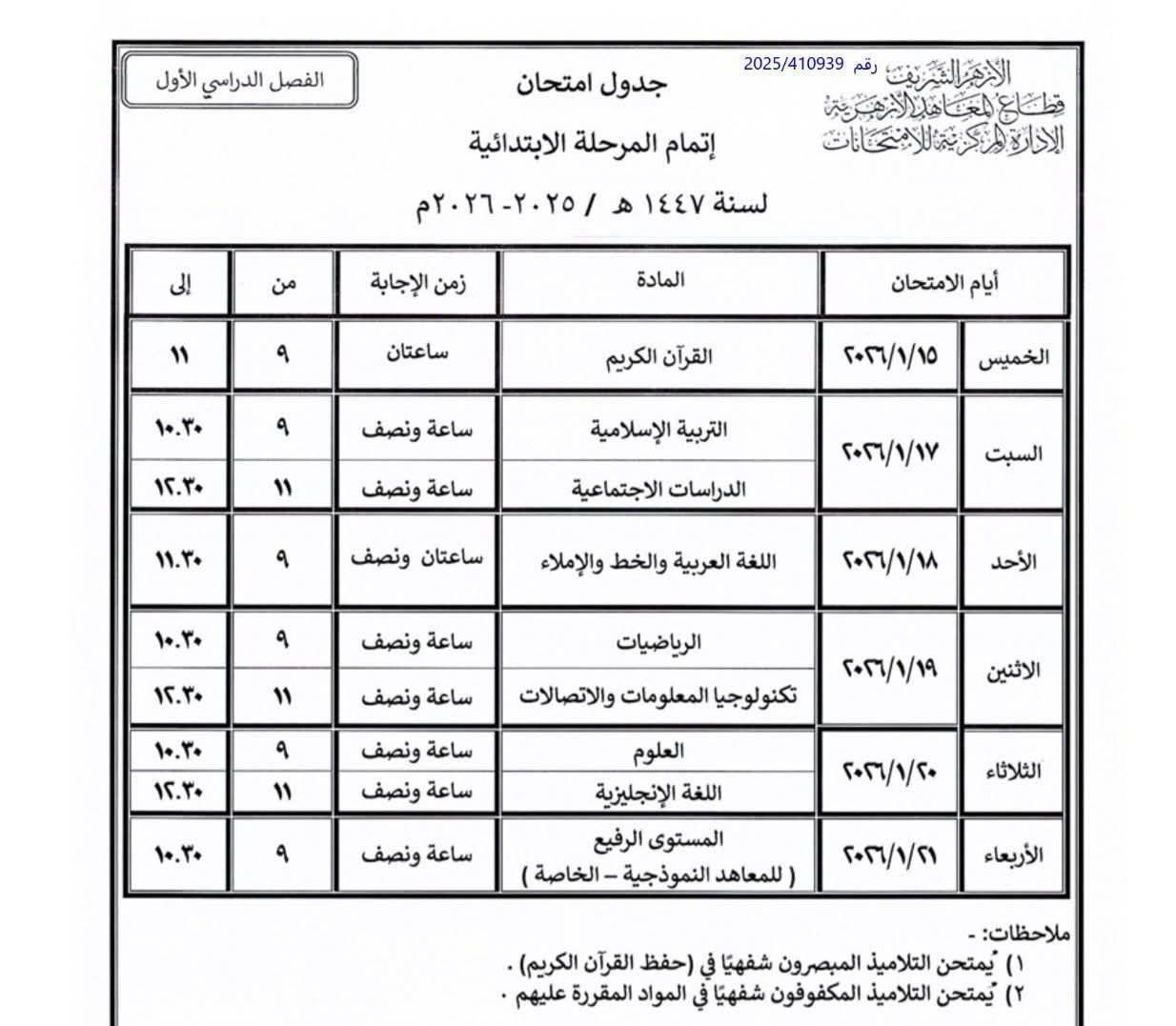 جدول امتحانات المرحلة الابتدائية الأزهرية في سوهاج