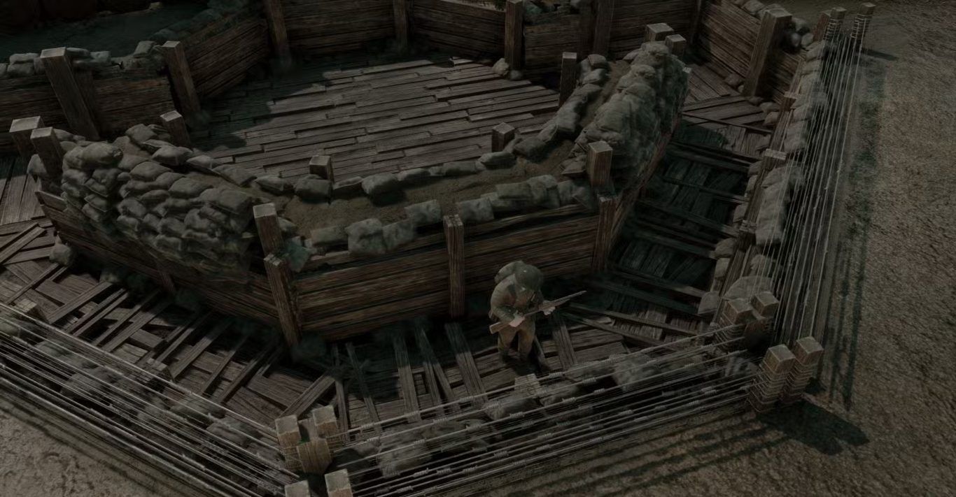 لا سيما في المراحل المبكرة من الحرب، وقبل أن تهيمن الدبابات، تشكل الخنادق جزءًا أساسيًا من التجربة، ويمكن حفرها تقريبًا في أي مكان وبأي شكل أو اتجاه، كما يمكن ترقيتها لتوفير حماية إضافية من المدفعية. ويمكن أيضًا تدعيم جوانب الخنادق بالأسلاك الشائكة أو أكياس الرمل إذا توفرت، وتركيب رشاشات آلية في حال حاول العدو الاقتحام. وفي القتال القريب، يمكن استخدام الحراب أو الهراوات المسننة، بينما يصرخ الجرحى طلبًا للمسعفين أو يُطلق نداء لارتداء أقنعة الغاز.