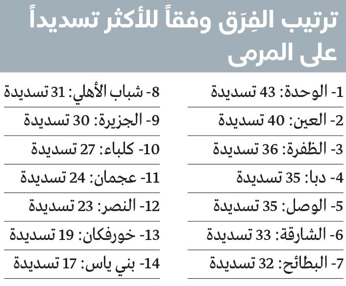 يعاني فريق دبا عدم ترجمة كثافة تسديدات لاعبيه على المرمى بالشكل المطلوب، في المباريات التي خاضها الفريق خلال موسمه الحالي، مع عودته إلى دوري «أدنوك» للمحترفين، خصوصاً أن «النواخذة» يحتلون حالياً المركز الرابع مناصفة مع الوصل، من حيث أكثر الأندية تسديداً على المرمى (35 تسديدة)، في مركز لا يعكس الموقع الحالي لدبا على سلم الترتيب للفرق باحتلاله المركز الأخير، وسعيه الدؤوب لترجمة هذه الفرص في تحقيق انتصاره الأول بعد مضي ثماني جولات من عمر الدوري، بينما تصدر الوحدة القائمة بـ 43 تسديدة، مقابل تذيل بني ياس الترتيب بـ17 تسديدة فقط.