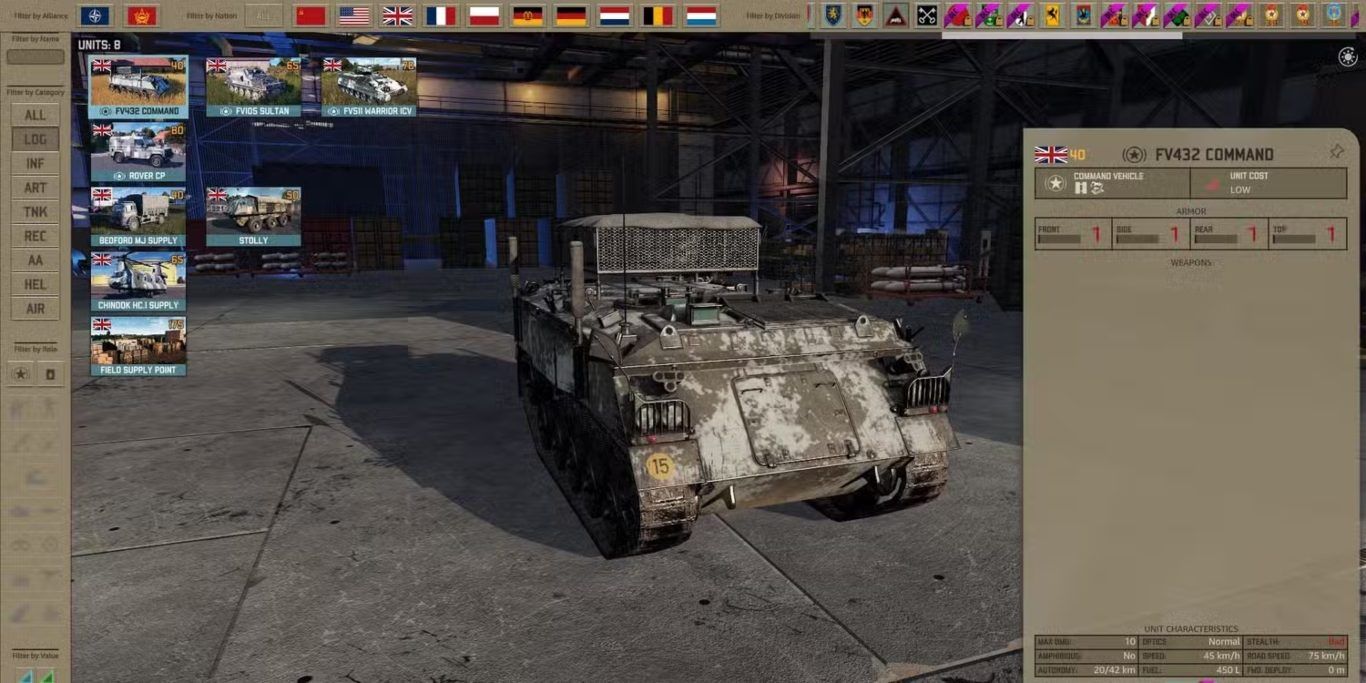 توفر هذه الفرقة البريطانية مجموعة واسعة من خيارات الدبابات، وعلى رأسها Challenger Mk.3، التي تُعد خصمًا قويًا لدبابة T-80UD السوفيتية، رغم أنها لا تتفوق عليها في الإحصاءات. ما يعزز قوة الفرقة بشكل إضافي هو وحدات مضادة للدبابات مستقلة قادرة على إطلاق ما يصل إلى ستة عشر صاروخًا مع قدرة اختراق تبلغ 23.