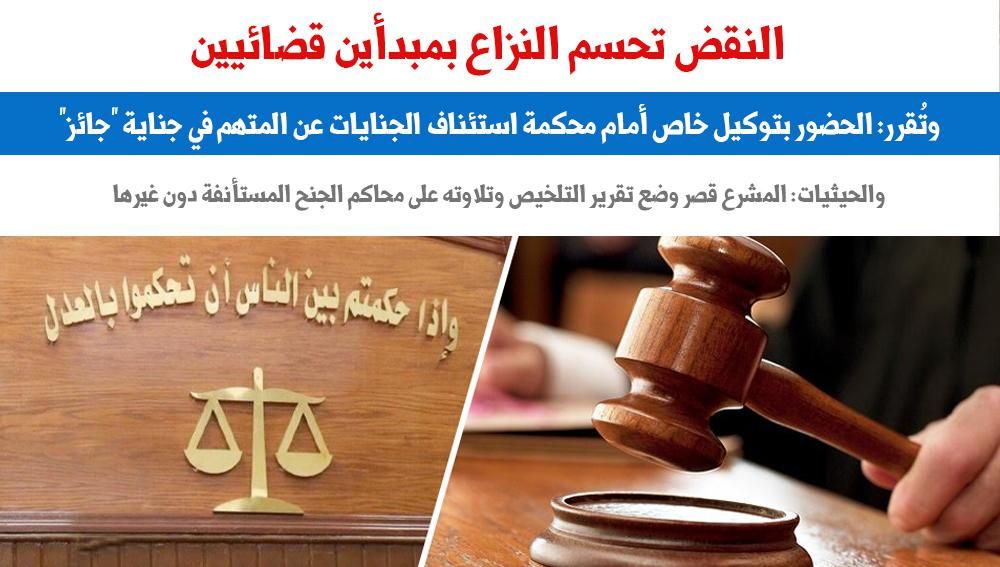 وإليكم التفاصيل كاملة:النقض تحسم النزاع بمبدأين قضائيين.. وتُقرر: الحضور بتوكيل خاص أمام محكمة استئناف الجنايات عن المتهم في جناية "جائز".. والحيثيات تؤكد: المشرع قصر وضع تقرير التلخيص وتلاوته على محاكم الجنح المستأنفة دون غيرها