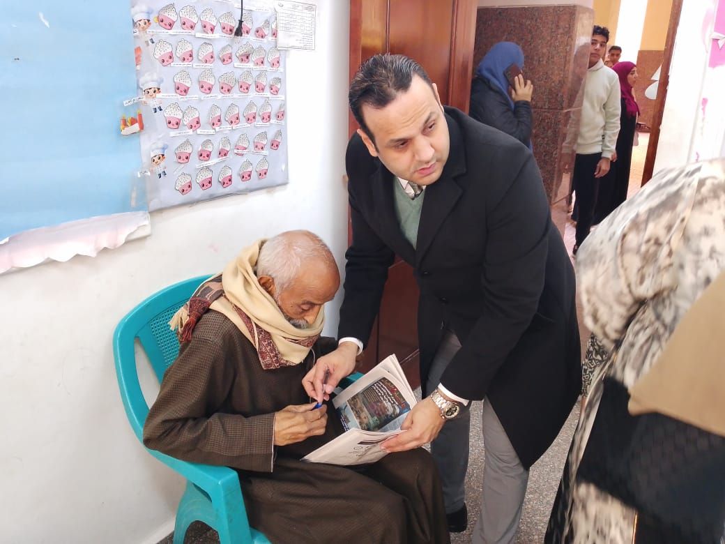 ساعد المستشار إيهاب المهدي، رئيس اللجنة 43 الفرعية في المطرية، ناخبا مسنا على الإدلاء بصوته في الانتخابات البرلمانية.