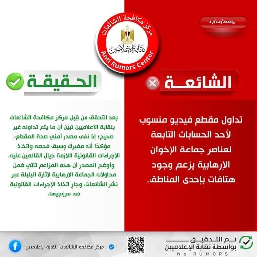 وبعد التحقق من قِبل مركز مكافحة الشائعات بنقابة الإعلاميين تبيّن أن ما يتم تداوله غير صحيح، إذ نفى مصدر أمني صحة المقطع، مؤكدًا أنه مفبرك وسبق فحصه واتخاذ الإجراءات القانونية اللازمة حيال القائمين عليه.