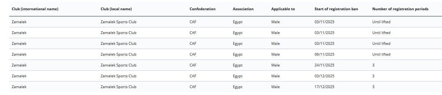 ونشر الموقع الرسمي لـ الفيفا، بتاريخ اليوم الأربعاء 17 ديسمبر، إيقاف قيد نادي الزمالك في القضية السابعة. ولم يكشف فيفا عن هوية أو تفاصيل الأطراف المتسببة في قرارات الإيقاف، مكتفيًا بالإشارة إلى أن القيد موقوف لحين تسوية النزاعات المالية المرتبطة بالقضايا الثلاث.