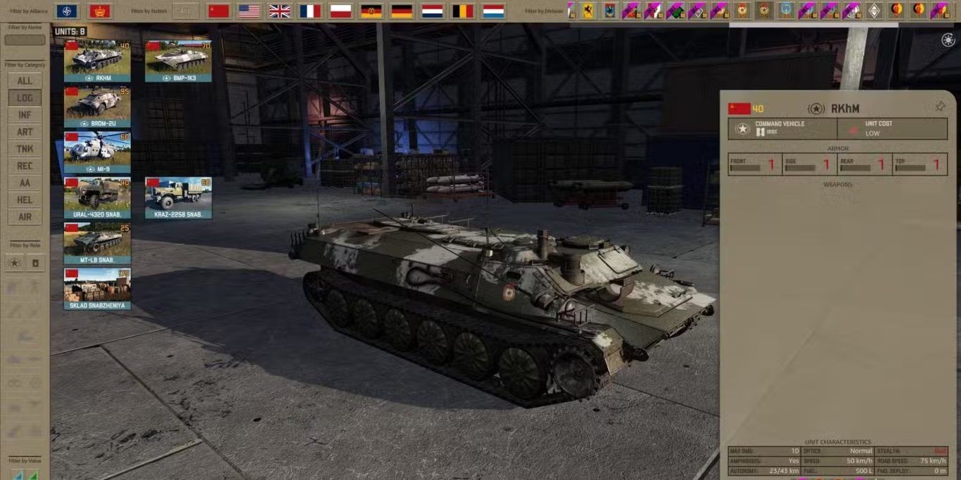 في فئة المدفعية، تقتصر الخيارات على مدافع الهاوتزر المخصصة للأهداف بعيدة المدى، بينما تُعد TOS-1 راجمة الصواريخ المتعددة الوحيدة المتاحة، والتي لا يمكنها استهداف أهداف تبعد أكثر من 3.5 كيلومترات. ومع ذلك، تُعد فئتا الدفاع الجوي والمروحيات مقبولتين، وتقدمان عددًا من الوحدات القادرة على أداء مهامها بكفاءة.