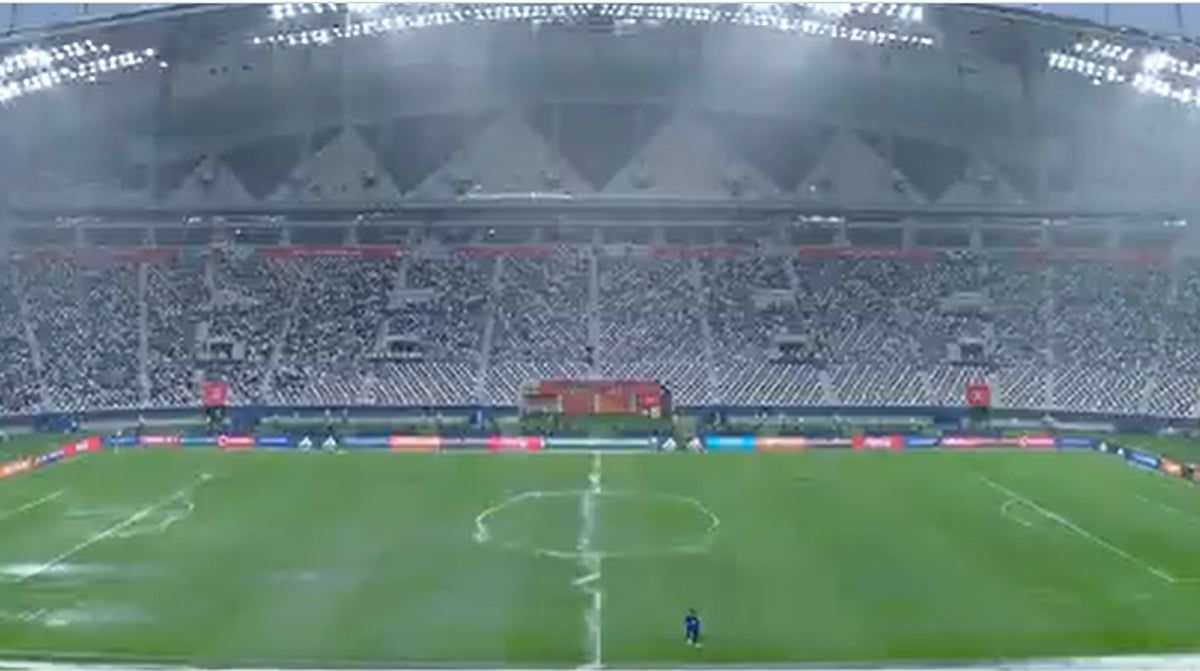فيما أعطى طاقم حكام اللقاء نصف ساعة للتأكد من جاهزية أرضية الملعب واتخاذ القرار النهائي الذي يخص مصير اللقاء.