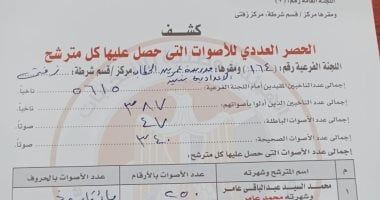 إجمالي عدد الناخبين المقيدين 5615، إجمالي عدد الناخبين الذين ادلو بأصواتهم 387، اجمالي الاصوات الباطلة 47، إجمالي الأصوات الصحيحة 310، حصل المرشح محمد السيد عامر على 250 صوتًا، فيما حصل محمد منير ربيع على 235 أصوات، بينما حصل عنتر السيد جاد 151، صقر عبد الفتاح 265 صوتًا، محمد ربيع غزالة على 77 صوتًا، وحصل هيثم توفيق زغلول على 51 صوتًا.