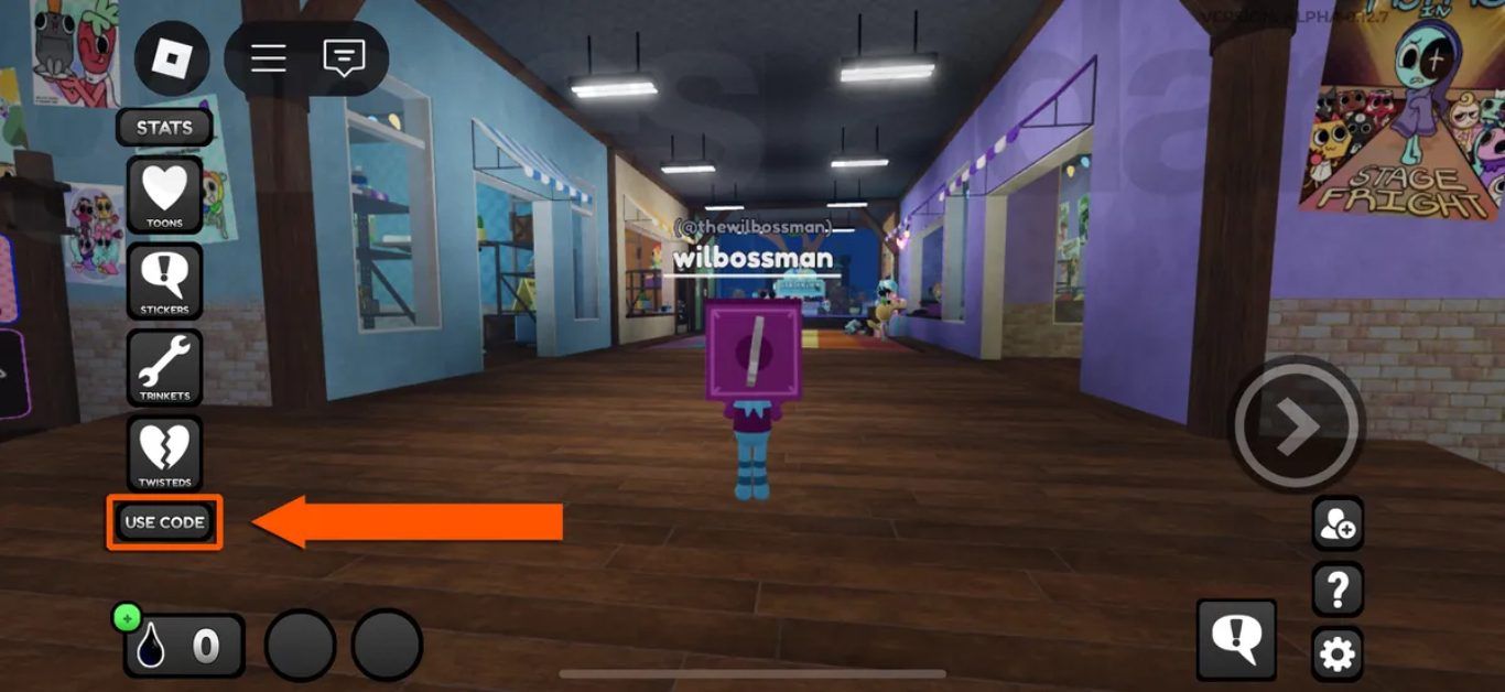 في أسفل هذا الشريط تظهر أيقونة واضحة تحمل اسم USE CODE. عند الضغط عليها يتم فتح نافذة جديدة مخصصة لإدخال الأكواد وتحمل عنوان INPUT A CODE. هذه النافذة هي المكان الوحيد الذي يتم من خلاله استبدال أكواد Dandys World.