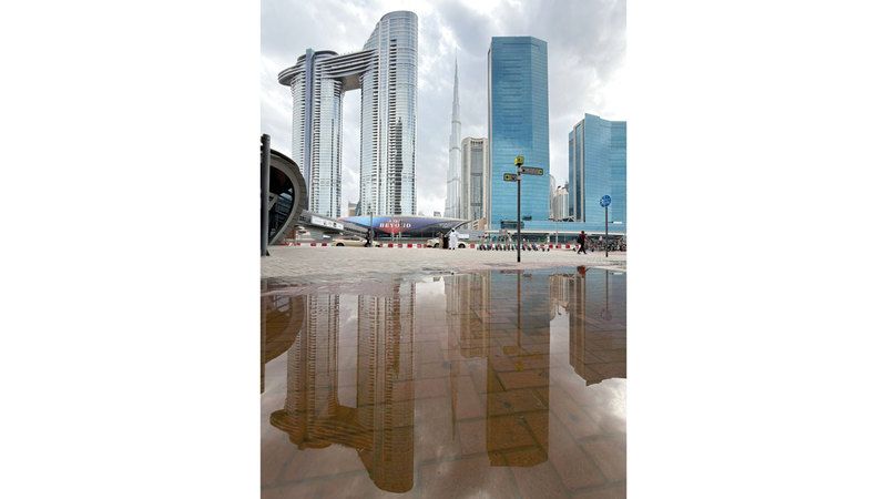 في مشهدٍ فني جميل تظهر صورة «برج خليفة» منعكسة على سطح مياه الأمطار، قرب شارع الشيخ زايد، وكأنما هي لوحة فنية مرسومة، بينما تكتسي السماء بالغيوم مع هطول الأمطار فجراً في دبي.