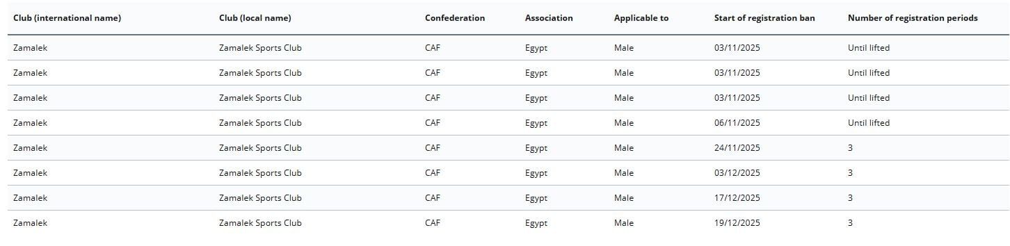 ونشر الموقع الرسمي لـ الفيفا، بتاريخ اليوم الجمعة 19 ديسمبر، إيقاف قيد نادي الزمالك في القضية الثامنة ولم يكشف فيفا عن هوية أو تفاصيل الأطراف المتسببة في قرارات الإيقاف، مكتفيًا بالإشارة إلى أن القيد موقوف لحين تسوية النزاعات المالية المرتبطة بالقضايا الثلاث.