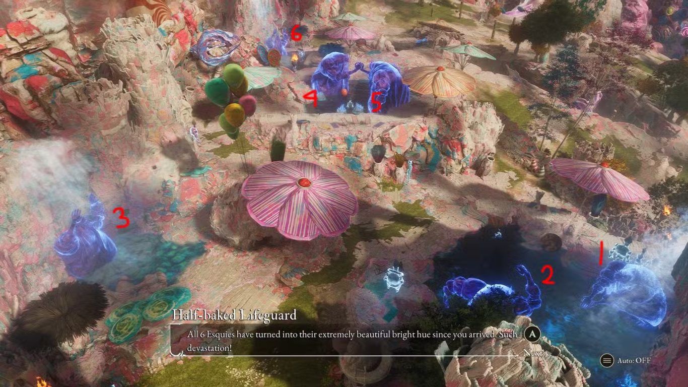 بعد التأكد من أن ثلاثة تماثيل Esquie أصبحت باللون الأزرق وأن الثلاثة الأخرى ما زالت باللون الأحمر يتعين على اللاعب التوجه مباشرة للتحدث مع شخصية Lifeguard المتواجدة في المنطقة القريبة.