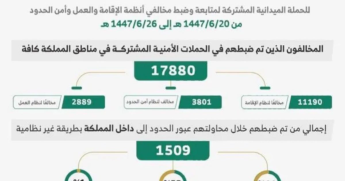 أسفرت الحملات الميدانية المشتركة لمتابعة وضبط مخالفي أنظمة الإقامة والعمل وأمن الحدود، التي نُفذت في جميع مناطق المملكة خلال الفترة من 20 إلى 26 / 6 / 1447هـ، الموافق 11 إلى 17 / 12 / 2025م، عن النتائج التالية: