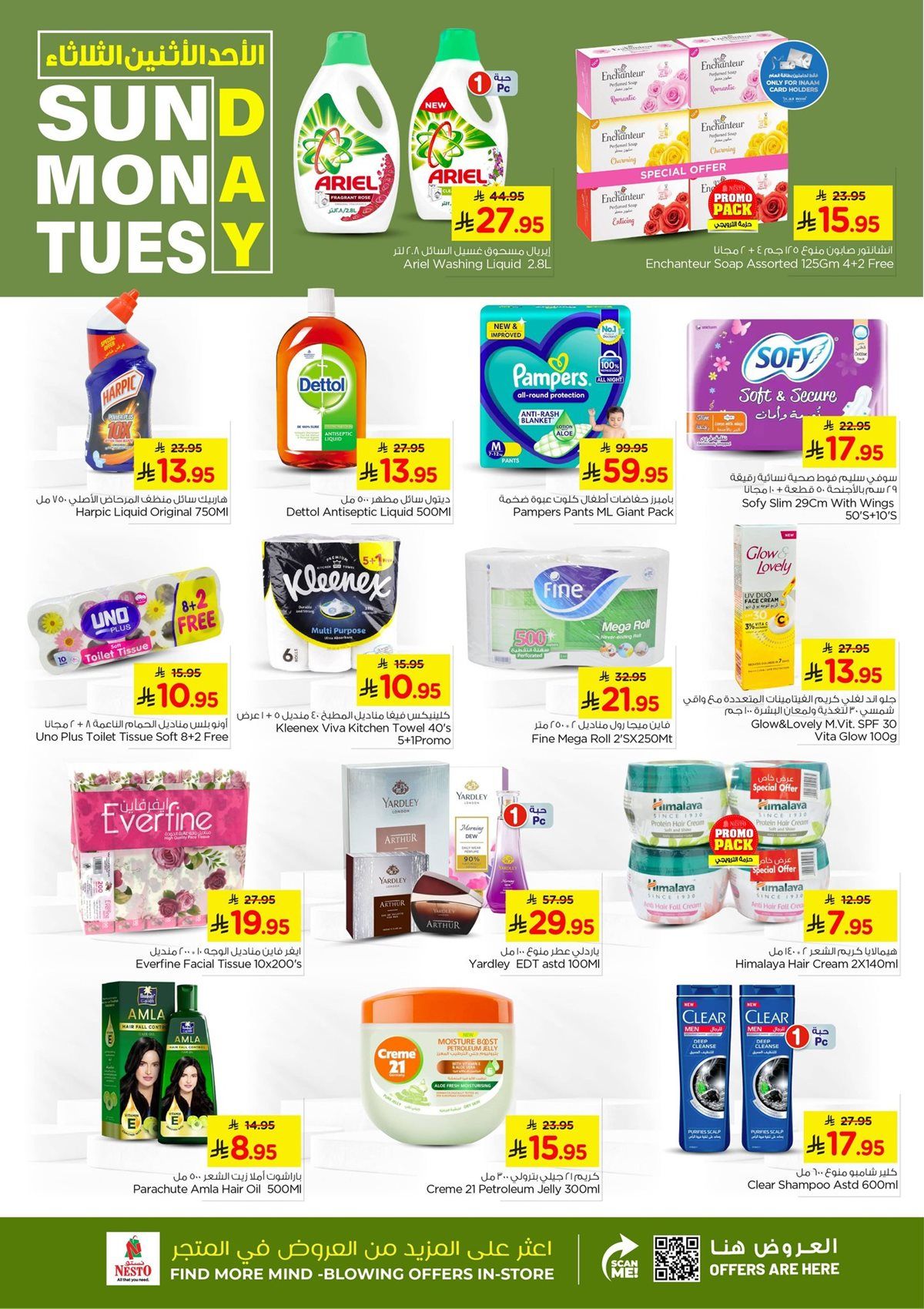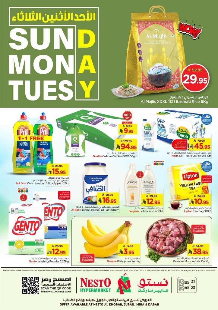 عروض نستو الدمام الطازج الاحد 1 رجب 1447هـ تشمل علي الأرز والزيت والسكر ومنتجات الألبان إضافة إلى المشروبات الساخنة والباردة بجانب الزيوت النباتية وزيت الزيتون والصلصات والمعلبات وتمتد لتشمل كمان الموز واللحوم الطازجة إلى جانب أصناف الدواجن المجمدة والقطع الجاهزة باقل الاسعار