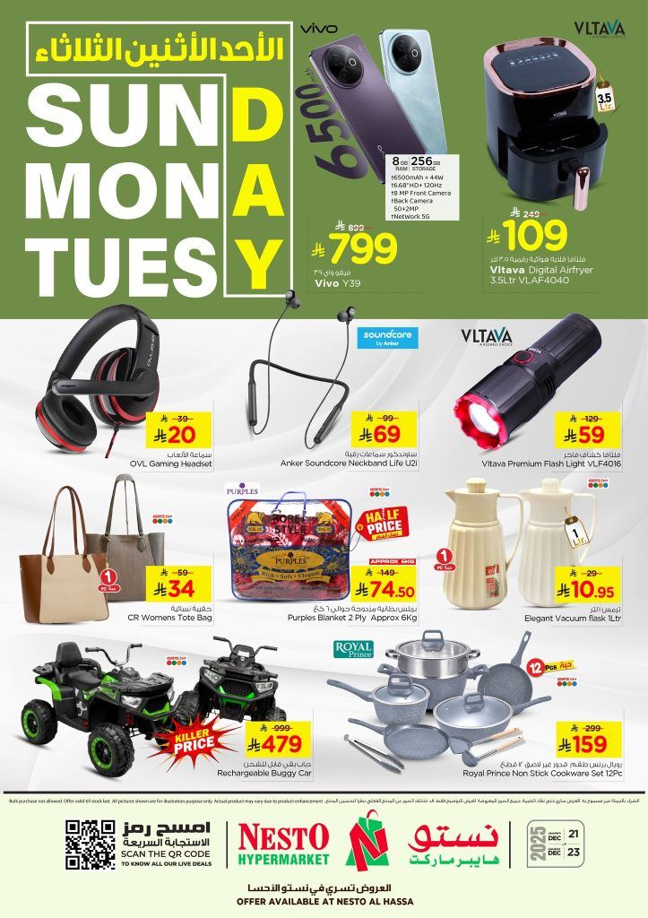 نقدم لكم احدث عروض نستو الاحساء بتاريخ الاحد 21 ديسمبر 2025 وتحتوي علي هواتف ذكية وسماعات رأس وسماعات بلوتوث وحقيبة نسائية وبطانية وعربة كهربائية للاطفال مع طقم قدور غير لاصقة وادوات مطبخ بجانب مجموعة من المواد الغذائية والمنتجات الاستهلاكية والخضروات والفواكه واللحوم والدواجن والاسماك