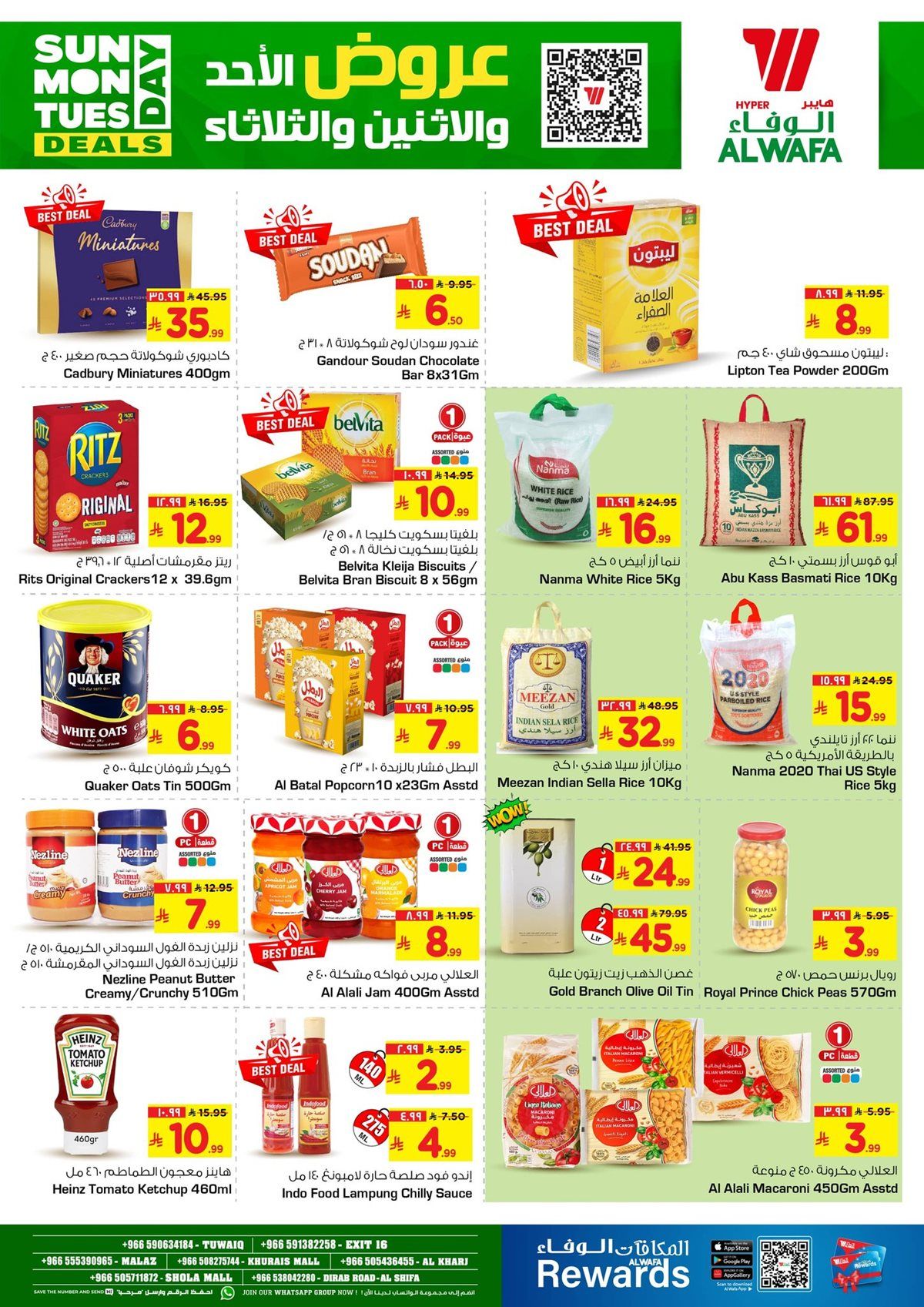 عروض الوفاء هايبر ماركت الاحد 21-12-2025 تحتوي علي تشكيلة واسعة من المنتجات الغذائية الاساسية من الارز بانواعه وحبوب الشوفان والمعكرونة والمكسرات اضافة الى الدجاج المجمد واللحم البقري والاغنام الطازجة والخضروات المتنوعة مثل الكوسة والخيار والباذنجان والبطاطا ورقائق البسكويت المالحة والفشار و الشاي والكاتشب