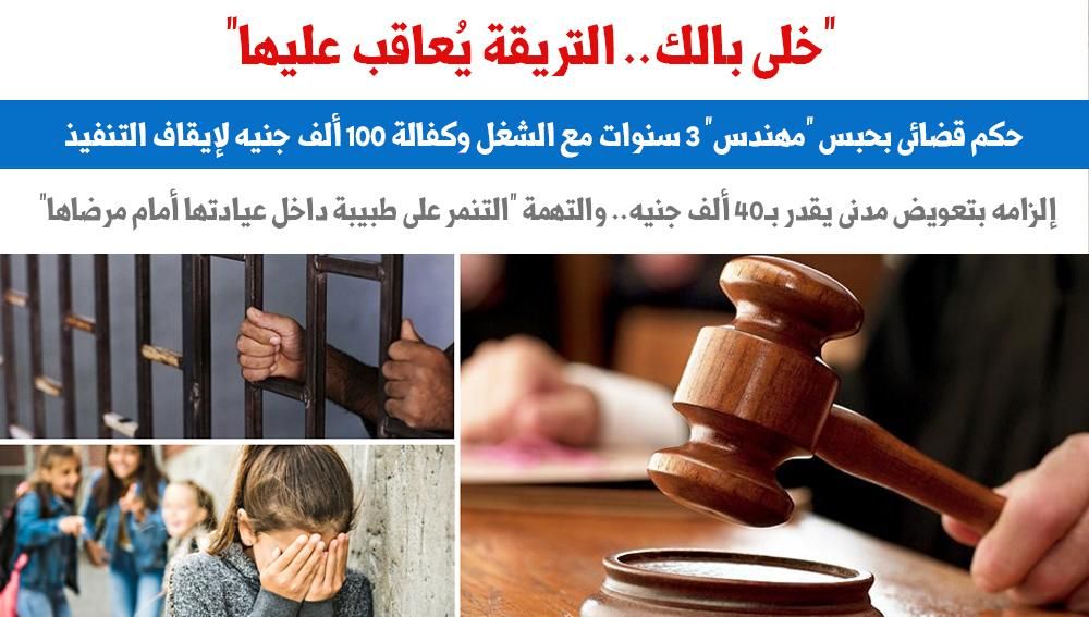 وإليكم التفاصيل كاملة:"خلى بالك التريقة أصبح يُعاقب عليها".. حكم قضائى بحبس "مهندس" 3 سنوات مع الشغل وكفالة 100 ألف جنيه لإيقاف التنفيذ.. وإلزامه بتعويض مدنى يقدر بـ40 ألف جنيه.. والتهمة "التنمر على طبيبة داخل عيادتها أمام مرضاها"