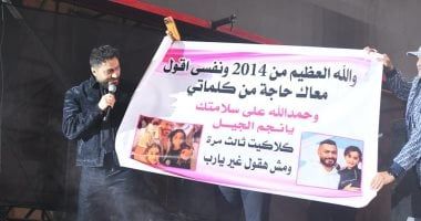 الجمهور يستقبل تامر حسني بالورود واللافتات
