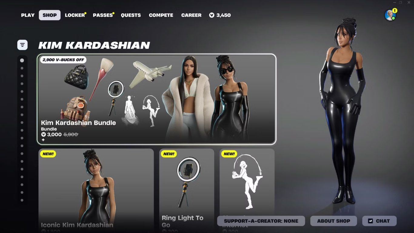 تشمل العناصر التجميلية المتاحة للشراء الفردي داخل Item Shop مظهر Iconic Kim Kardashian بسعر 1800 V Bucks. يتوافر عنصر Ring Light to Go بسعر 300 V Bucks. يتاح تعبير Slurp the Internet بسعر 300 V Bucks. يمكن شراء مظهر Kim Kardashian الأساسي بسعر 1500 V Bucks. يتوافر عنصر Kim Kit back bling بسعر 300 V Bucks. يمكن الحصول على أداة Full Beat Brush pickaxe بسعر 500 V Bucks. تتوافر أداة Bag Basher pickaxe بسعر 500 V Bucks. يتاح تعبير Diamond Drop بسعر 500 V Bucks. يمكن شراء طائرة Private Jet glider بسعر 800 V Bucks.