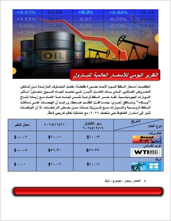 الأحد، 21 ديسمبر 2025 12:24 منشرت الهيئة المصرية العامة للبترول على صفحتها بمواقع التواصل الاجتماعى الأسعار العالمية للبترول اليوم الأحد الموافق 21-12-2025.