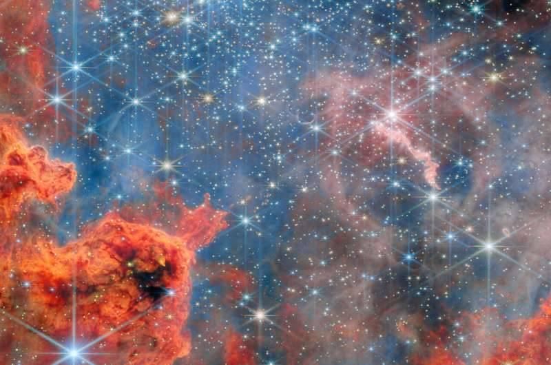 وتُبرز الصورة الجديدة دوامات من الغاز البرتقالي والأحمر التي تشكل جدراناً منحوتة بفعل الإشعاعات المكثفة للنجوم الفتية، بينما تظهر خيوط من المادة الرقيقة باللونين الأزرق والوردي تنجرف بين السحب الأكثر كثافة.