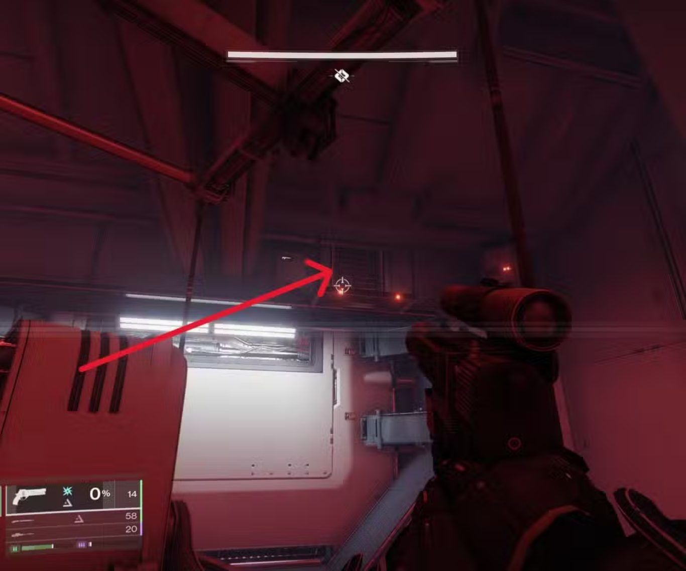 بعد الدخول من فتحة التهوية يستمر المسار بشكل خطي دون تفرعات جانبية مما يسهل عملية التنقل. مع التقدم للأمام يصل الفريق إلى باب مغلق لا يمكن فتحه بشكل مباشر. لفتح هذا الباب يجب استهداف ثلاث بطاريات زرقاء موزعة بالقرب من الباب المغلق وعلى الجهة المقابلة له. تدمير هذه البطاريات يؤدي إلى فتح الباب ومتابعة التقدم داخل السفينة.