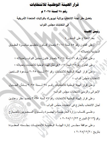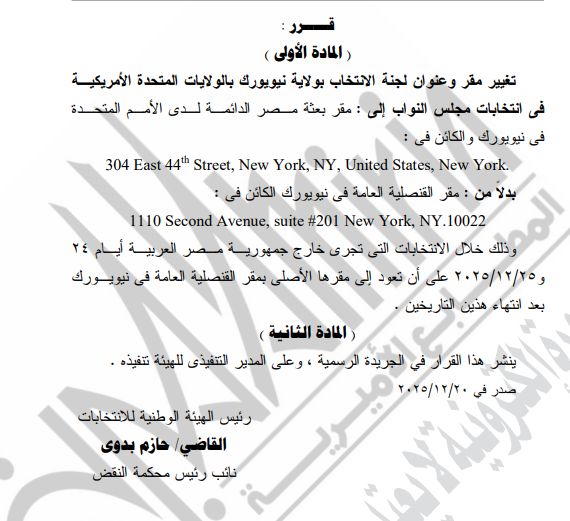 الإثنين، 22 ديسمبر 2025 02:29 منشرت الجريدة الرسمية اليوم قرار الهيئة الوطنية للانتخابات برئاسة القاضي حازم بدوى بتغيير مقر وعنوان لجنة الانتخاب بولاية نيويورك بالولايات المتحدة الأمريكية في انتخابات مجلس النواب إلى مقر بعثة مصر الدائمة لدى الأمم المتحدة في نيويورك والكائن في 304 East 44th Street, New York, NY, United States, New York، بدلا من مقر القنصلية العامة في نيويورك الكائن في 1110 Second Avenue, suite #201 New York, NY.10022، وذلك خلال الانتخابات التي تجرى خارج جمهورية مصر العربية أيام 24 و25 ديسمبر الجاري، على أن تعود إلى مقرها الأصلى بمقر القنصلية العامة في نيويورك بعد انتهاء هذين التاريخين.
