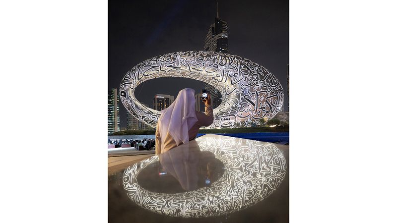 كما الأيقونة المتوهجة بالأنوار والألوان والحروف العربية.. متحف المستقبل في قلب دبي يتألق بأضوائه الفضية، لتنعكس على الأرجاء، وتجتذب الكاميرات التي تقدّر اللوحات المتفردة، لاسيما حينما يرسمها «أجمل مبنى على وجه الأرض»، الذي يحتضن أفكاراً وأحلاماً تنتمي للغد، ويراهن على ابتكارات العقول اللامعة، ويسلط الضوء على اختراعات تسعى لجعل حياة البشر أفضل.