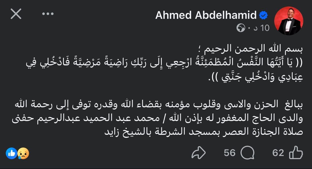 وتابع: "ببالغ الحزن والاسى وقلوب مؤمنه بقضاء الله وقدره توفى إلى رحمة الله والدى الحاج المغفور له بإذن الله / محمد عبد الحميد عبدالرحيم حفنى صلاة الجنازة العصر بمسجد الشرطة بالشيخ زايد".