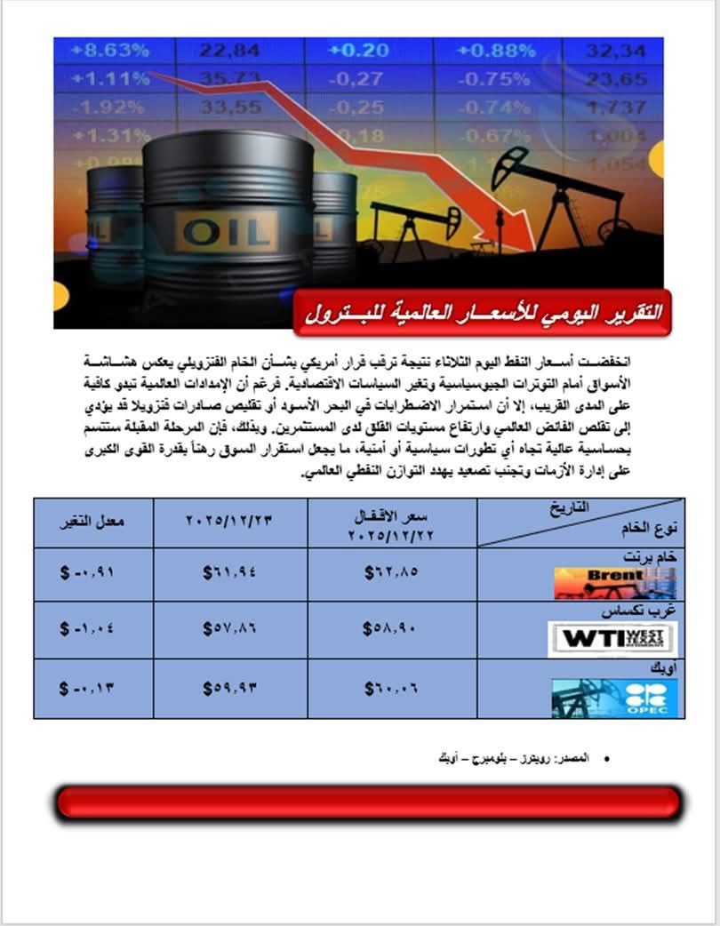 وأشار التقرير اليومى للأسعار العالمية للبترول، انخفاض أسعار النفط اليوم الثلاثاء نتيجة ترقب قرار أمريكي بشأن الخام الفنزويلي يعكس هشاشة الأسواق أمام التوترات الجيوسياسية وتغير السياسات الاقتصادية. فرغم أن الإمدادات العالمية تبدو كافية على المدى القريب، إلا أن استمرار الاضطرابات في البحر الأسود أو تقليص صادرات فنزويلا قد يؤدي إلى تقلص الفائض العالمي وارتفاع مستويات القلق لدى المستثمرين. وبذلك، فإن المرحلة المقبلة ستتسم بحساسية عالية تجاه أي تطورات سياسية أو أمنية، ما يجعل استقرار السوق رهناً بقدرة القوى الكبرى على إدارة الأزمات وتجنب تصعيد يهدد التوازن النقطي العالمي.