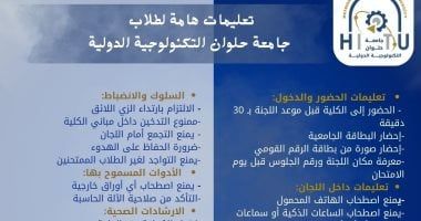 أعلنت جامعة حلوان التكنولوجية الدولية عن حزمة من التعليمات والإرشادات التنظيمية الهامة للطلاب ، وذلك في إطار الاستعداد لبدء امتحانات الفصل الدراسي الأول للعام الجامعي 2025/2026، بما يضمن انتظام سير الامتحانات وتحقيق أعلى درجات الانضباط داخل اللجان، وذلك تحت رعاية الدكتور السيد قنديل رئيس الجامعة ، و إشراف الدكتور أسامة القبيصي المشرف الأكاديمي لجامعة حلوان التكنولوجية الدولية ورئيس لجنة سير الامتحانات، وبمتابعة الدكتور أحمد سويدان،منسق برنامج تكنولوجيا الميكاترونكس.