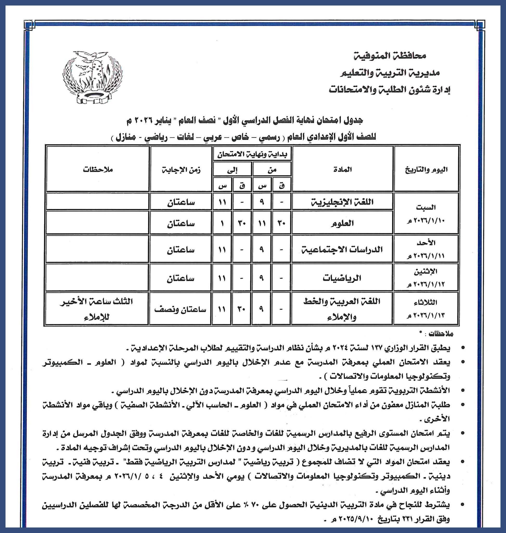 الثلاثاء، 23 ديسمبر 2025 02:34 مينشر اليوم السابع جدول امتحانات الصف الدراسى الأول للمرحلة الإعدادية من الصف الاول حتى الثالث الإعدادى.