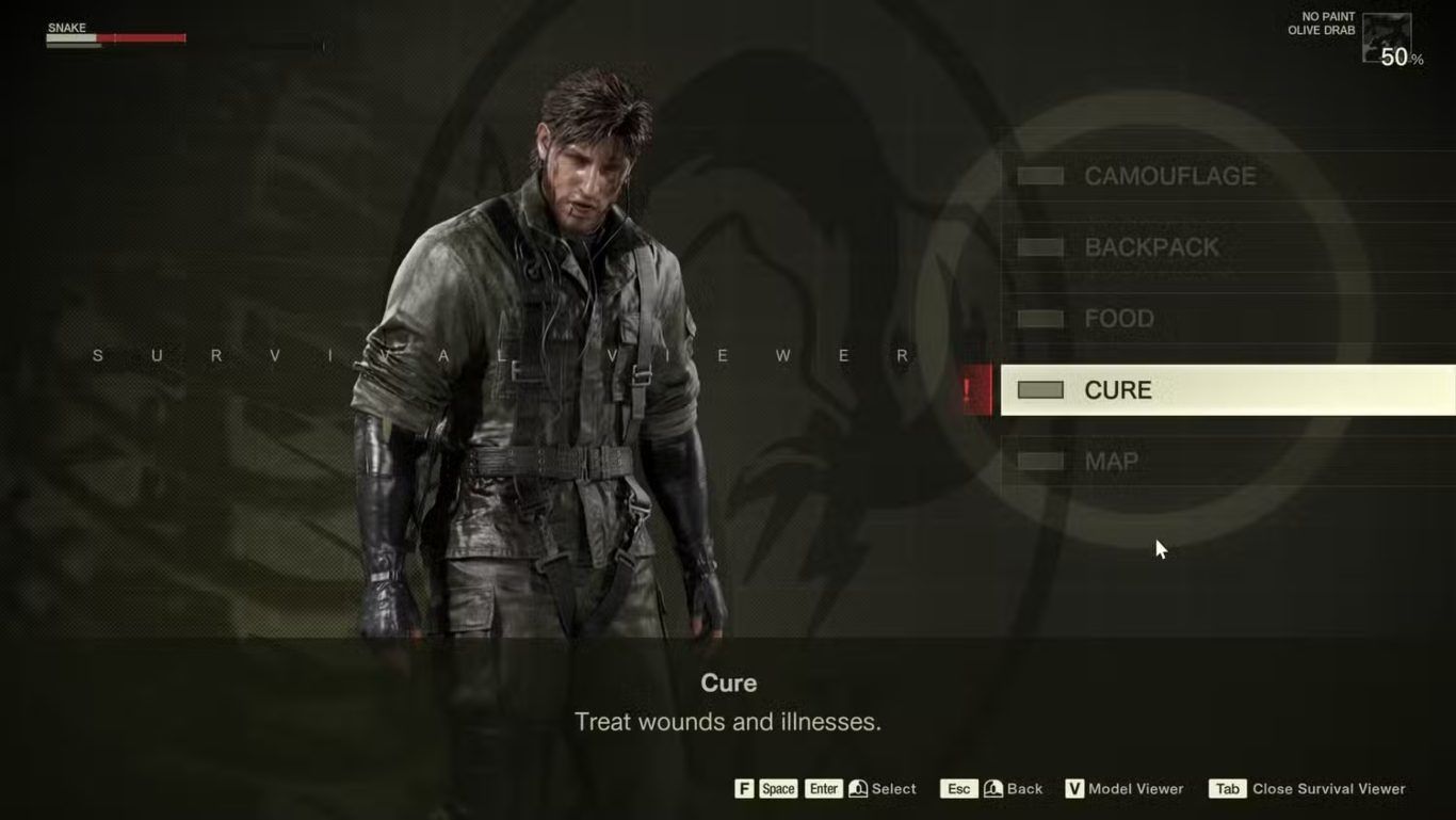 تنقسم صحة Snake وقدرته على التحمل إلى فئتين منفصلتين. يمكن علاج صحة Snake باستخدام وظيفة Cure، بينما يمكن تعزيز القدرة على التحمل باستخدام وظيفة Food. من الضروري للغاية أن يحرص اللاعبون على العناية بـ Snake، لذلك بعد أي تنقل عبر الأدغال أو أي مواجهة قتالية، يجب التأكد من فحص شاشة Cure لعلاج Snake إذا كان قد تعرّض لإصابات بسبب التضاريس أو كائنات المستنقعات أو هجمات الأعداء. يساعد علاج Snake على بقائه قويًا خلال مواجهات الأعداء ومعارك الزعماء، في حين يخدم تناول الطعام هدفًا مختلفًا. ينبغي الحرص على عدم ترك Snake جائعًا، لأن المعدة الفارغة تُصدر أصواتًا تلفت انتباه الأعداء وتؤدي إلى فشل محاولات التسلل. إلى جانب توفير الغذاء، يمنح الطعام Snake قدرة أكبر على التحمل، مما يقلل من شعوره بالإرهاق ويجعله قادرًا على تنفيذ المزيد من المهام. يمكن العثور على الطعام في جميع أنحاء الأدغال، لذلك يمكن نصب الفخاخ وقتل الفئران والثعابين وغيرها من الكائنات البرية، وتجربة مختلف الأطعمة لمعرفة ما يطوّر Snake تفضيلًا له مع الوقت.