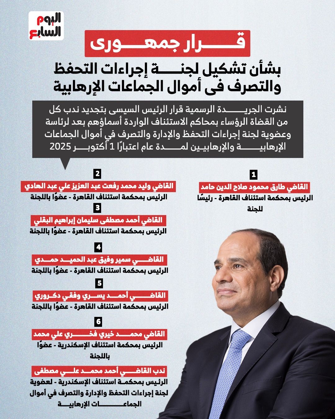 نشرت الجريدة الرسمية قرار السيد الرئيس عبد الفتاح السيسى، رقم 732 لسنة 2025 بتجديد ندب كل من القضاة الرؤساء بمحاكم الاستئناف الواردة أسماؤهم بعد ، لرئاسة وعضوية لجنة إجراءات التحفظ والإدارة والتصرف في أموال الجماعات الإرهابية والإرهابيين المشكلة بموجب المادة الثالثة من القانون رقم ٢٢ لسنة ٢٠١٨ مشار إليه، طوال الوقت ، لمدة عام اعتبارًا من ٢٠٢٥/١٠/١ ، وذلك على النحو التالي :