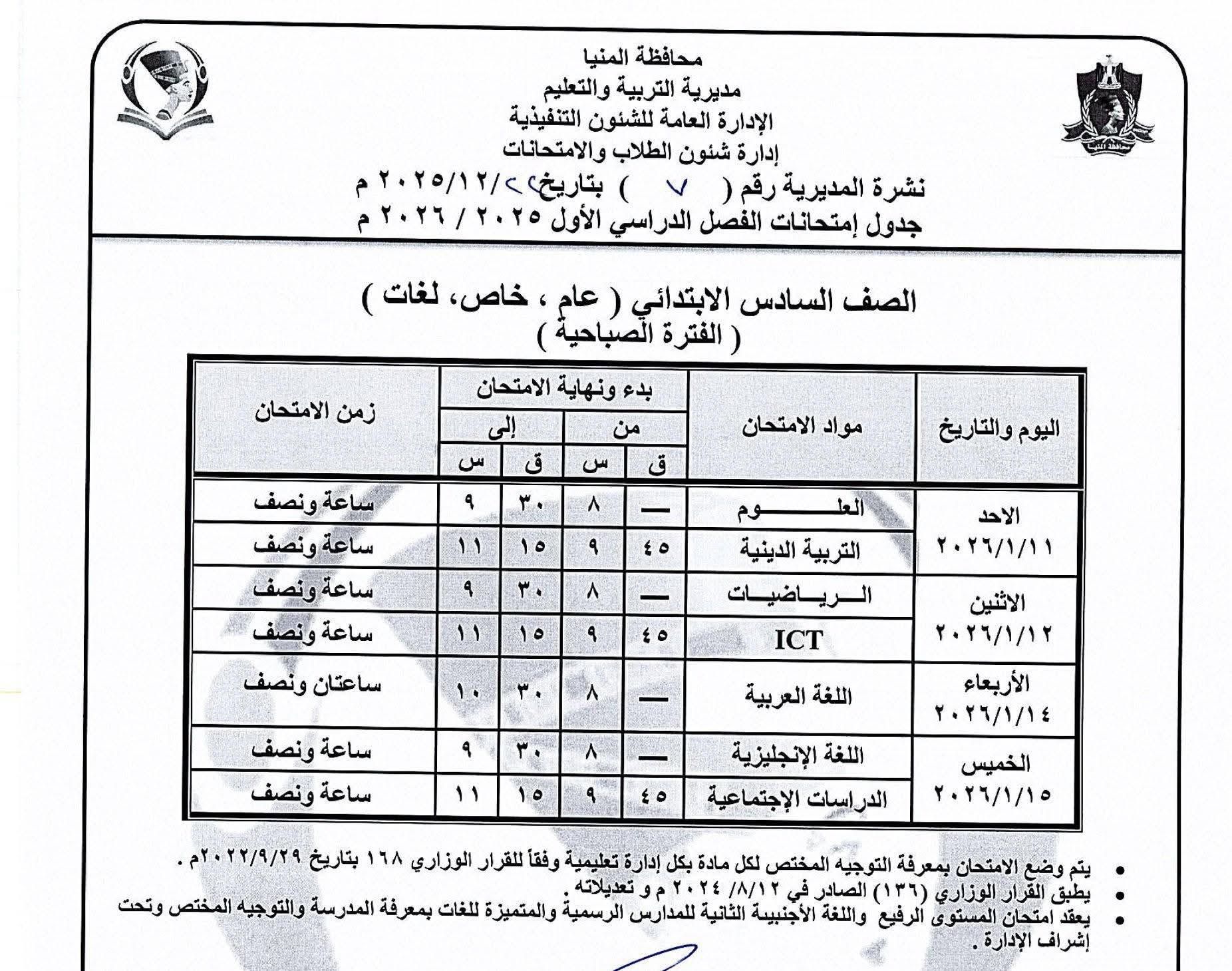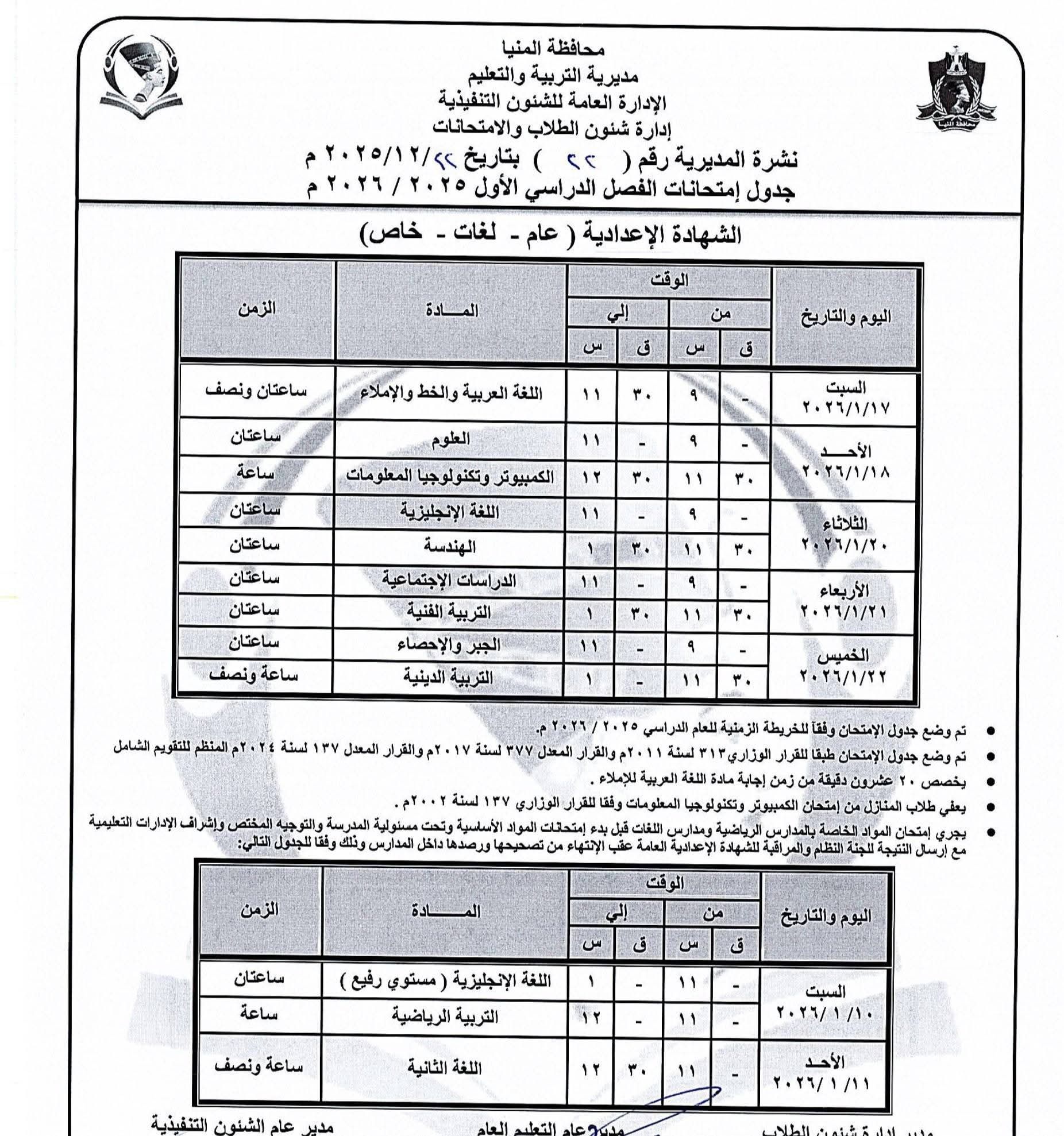 الأربعاء، 24 ديسمبر 2025 12:20 مينشر اليوم السابع جدول إمتحانات الفصل الدراسى الأول للمرحلة الإعدادية بمحافظة المنيا، 2025/ 2026،والتى سوف تبدأ يوم 10 يناير.