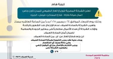 الأربعاء، 24 ديسمبر 2025 12:12 مأعلنت الشركة المصرية لتوزيع الغاز الطبيعي للمدن "تاون جاس" إحدى شركات قطاع البترول، عبر صفحتها على موقع التواصل الاجتماعي "فيس بوك"، عن أعمال صيانة طارئة شارع المساكن فيصل الجيزة، وذلك غدا الأربعاء بدءا من الساعة العاشرة مساء.