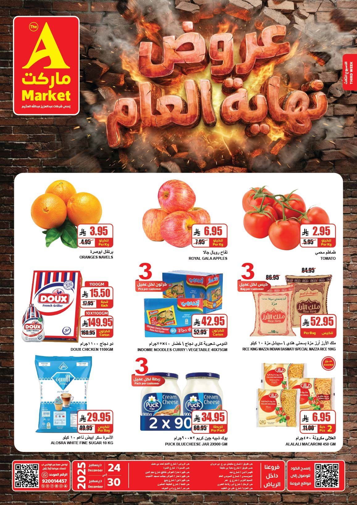 عروض ايه ماركت الرياض الأربعاء 24 ديسمبر 2025 تحتوي علي الفجل الأبيض والبصل الأخضر والبطاطا والشمام والعنب الأحمر وبذور الكتان وزيت السمسم ودبس التمر ثم تمتد إلى الأجهزة مثل قدر ضغط يدوي ومفرمة أعشاب ميكانيكية وسخان أطعمة منزلي و خلاط للعصائر و غيرها من المنتجات باقل الاسعار