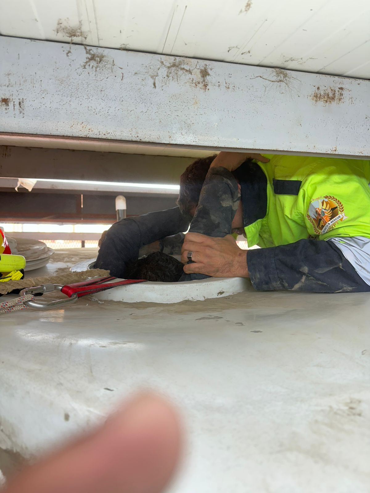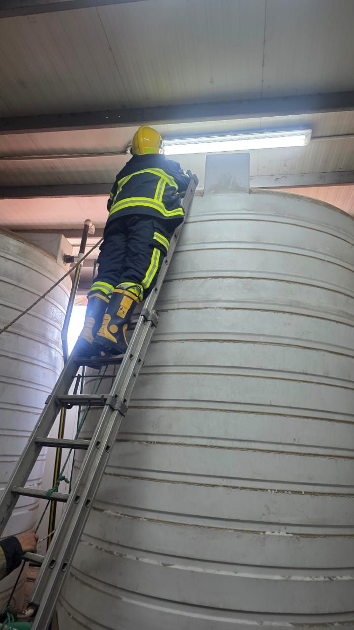 بالانتقال والفحص، تبين سقوط عدد (2) من العاملين (على قيد الحياه داخل خزان مياه بلاستيك (فارغ) سعته (10) متر مكعب عمقه (4) متر قطره متر ونصف أثناء أعمال التنظيف والصيانة لخزان المياه داخل مسطح أرضى سقف جمالون بداخله خزانات مياه + طلمبات ) وتم إنقاذ العاملين واستخراجهم من داخل الخزان وتم اتخاذ الإجراءات القانونية اللازمة تجاه الواقعة.