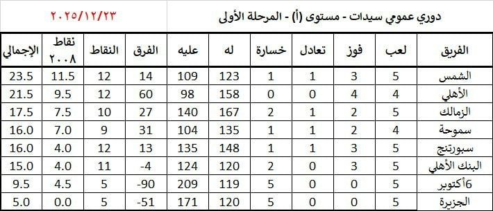 و يتبقي لفريق الأهلي مباراة مؤجلة ، بينما يحل الزمالك في المركز الثالث برصيد 10 نقاط فيما يتواجد الشمس علي صدارة الترتيب .